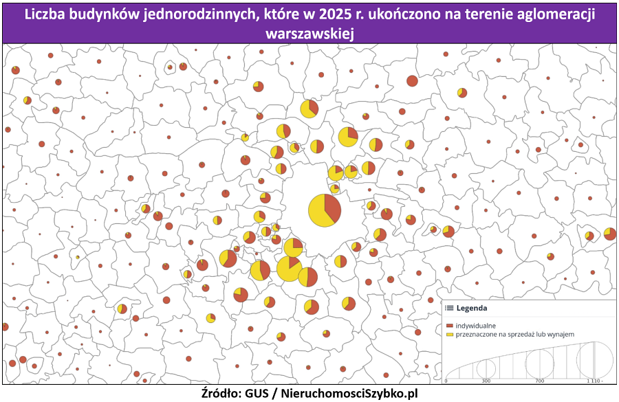 Zarówno przygotowana mapa, jak i powyższa lista potwierdza, że w wielu lokalizacjach większość domów jednorodzinnych została według GUS wybudowana na sprzedaż lub wynajem (de facto tylko na sprzedaż). „W przypadku dwudziestu wiodących gmin aglomeracji warszawskiej, udział deweloperów dotyczący ukończonych budynków jednorodzinnych wyniósł aż 58%” - informuje Leszek Markiewicz, prowadzący agencję nieruchomości z Warszawy, NieruchomosciSzybko.pl.